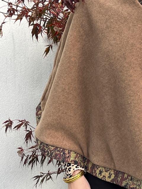 Women's cape in thick, very warm fleece trimmed with faux fur or printed material - made in France -
