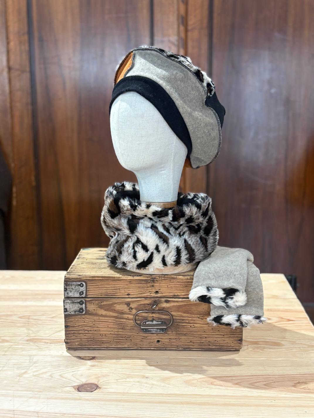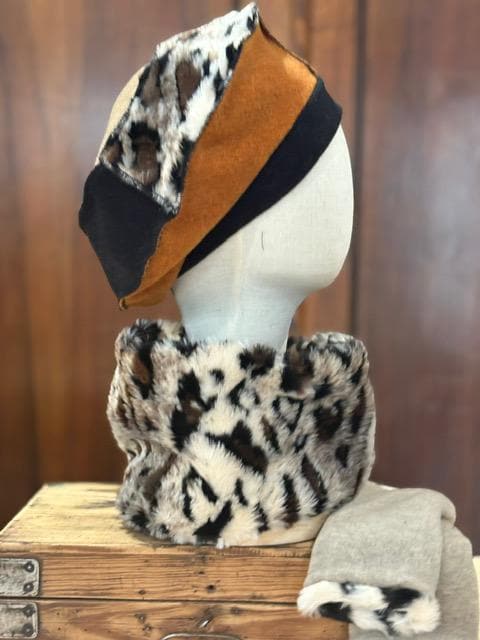 This women's snood in two materials, easier to put on than a scarf, will be the ideal Christmas gift, it will keep your neck warm thanks to its ultra soft and very pleasant leopard faux fur lined with ecru microfleece, it can be matched with your multicoloured beret and mittens or headband.