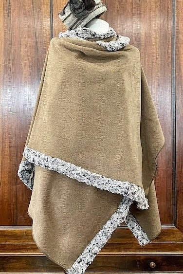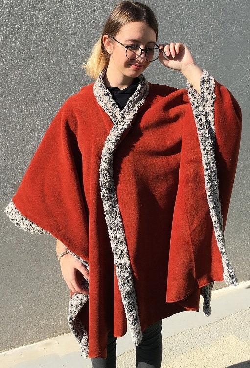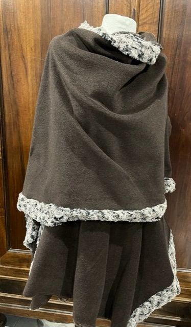 This poncho, made entirely of fleece and trimmed with faux fur,