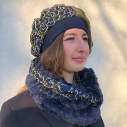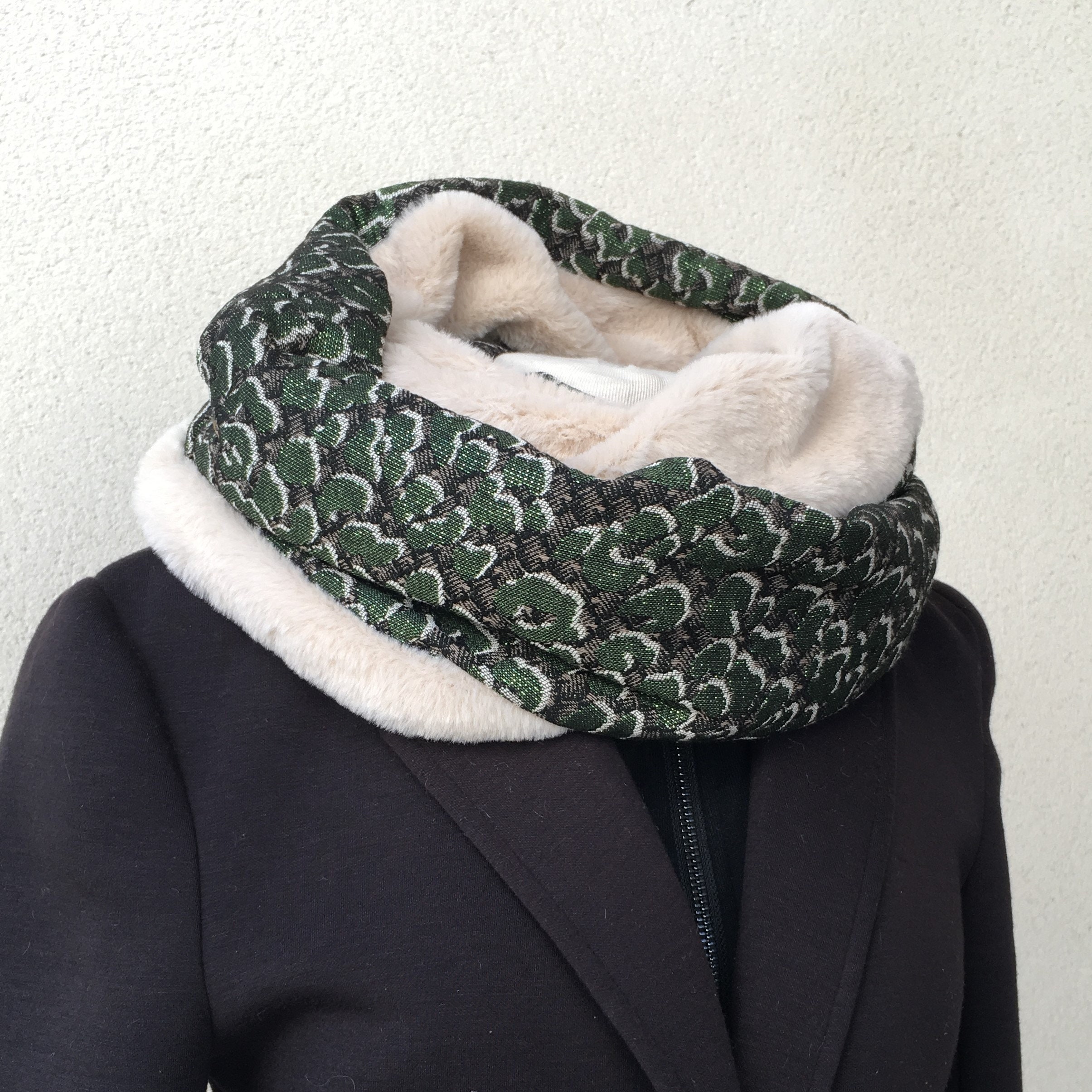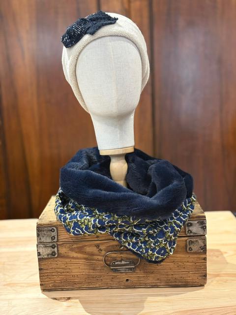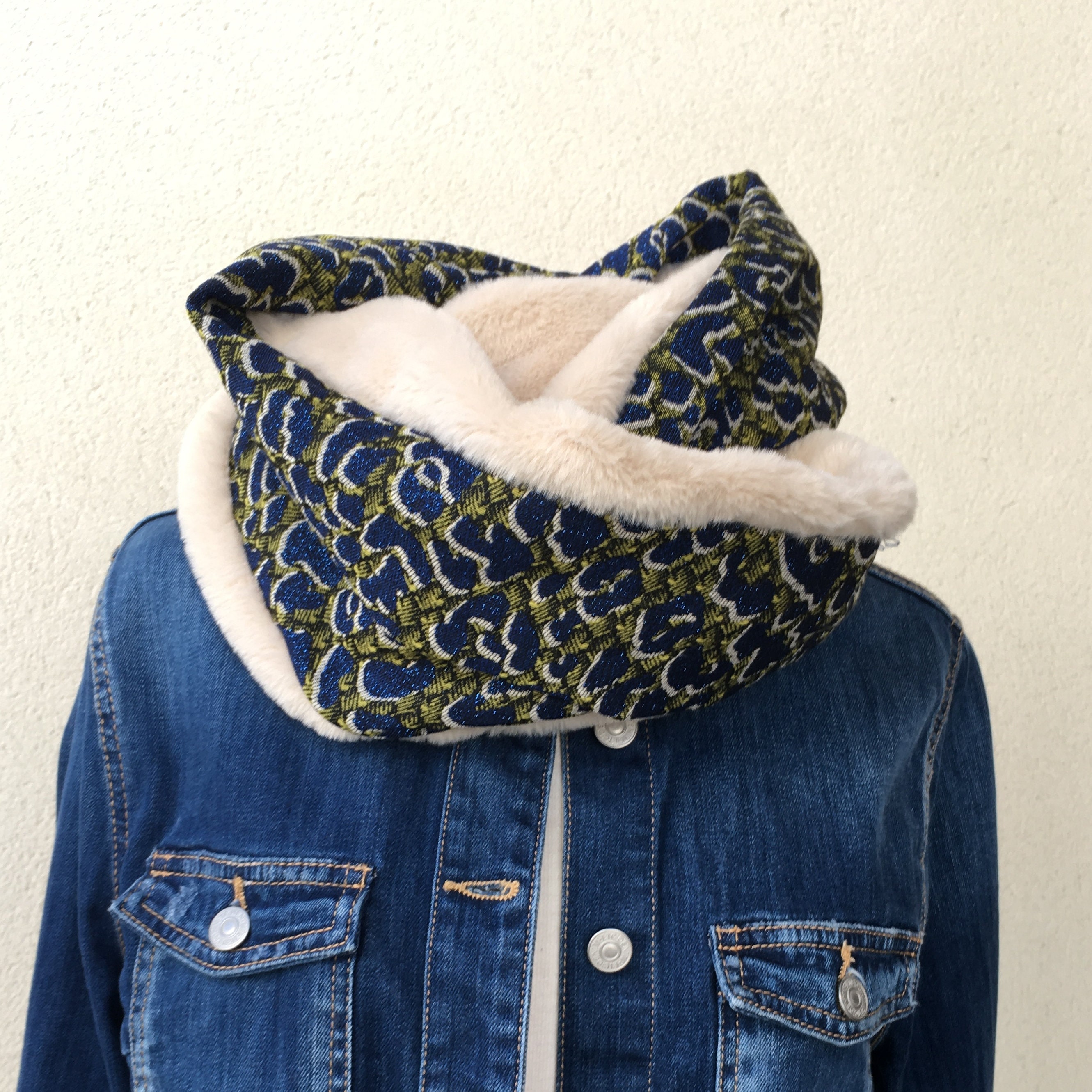 Predominantly blue or predominantly khaki in color, it will keep your neck nice and warm thanks to the softness of its fur.