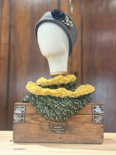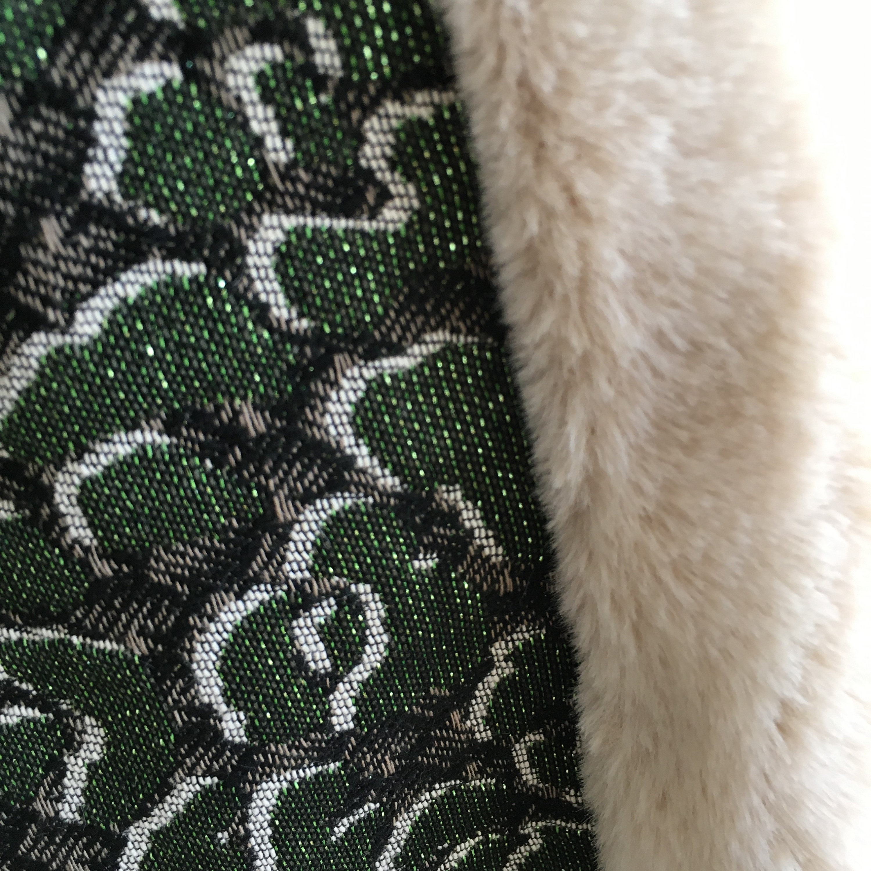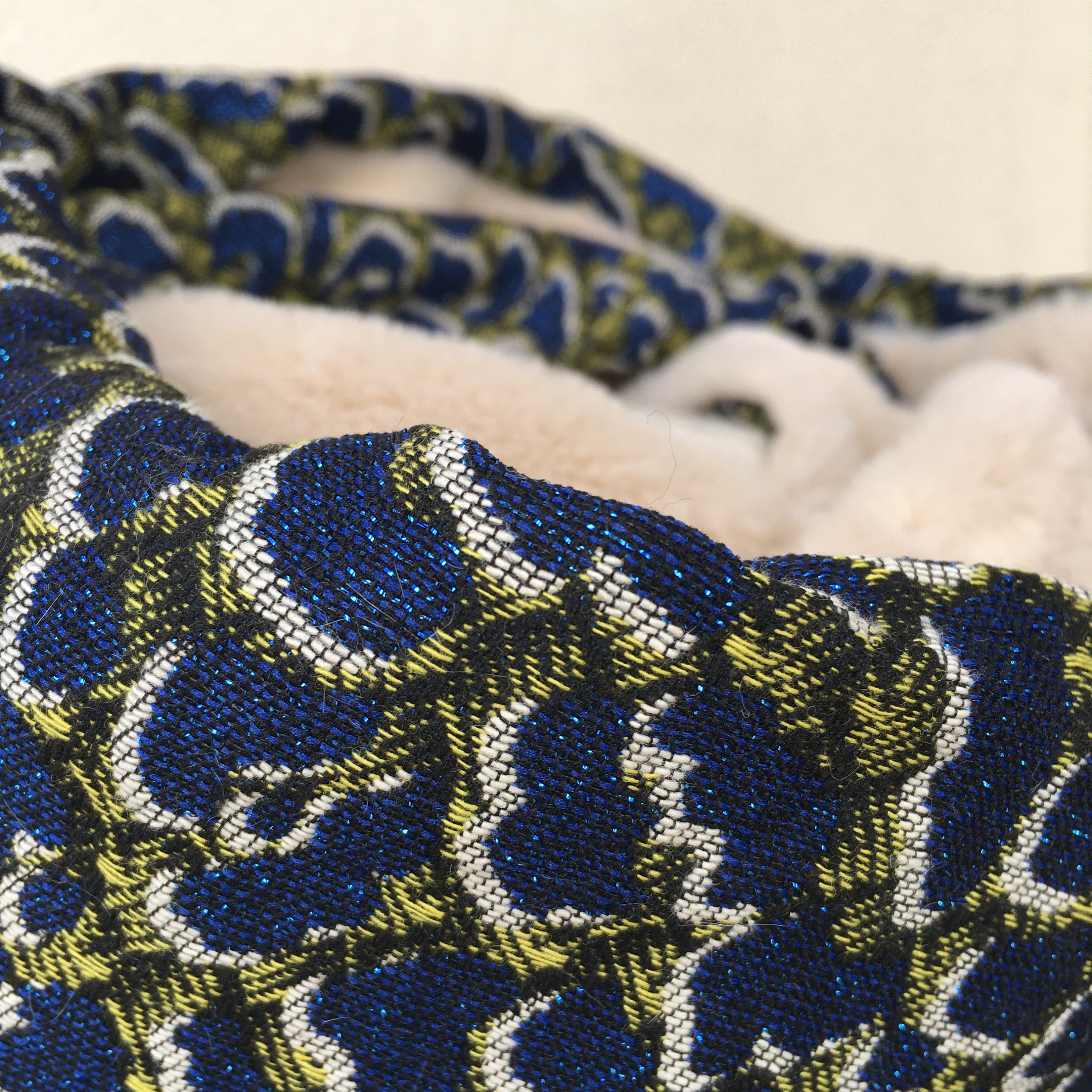 This double collar in two colours: ivory fur interior and bright multicoloured fabric exterior;